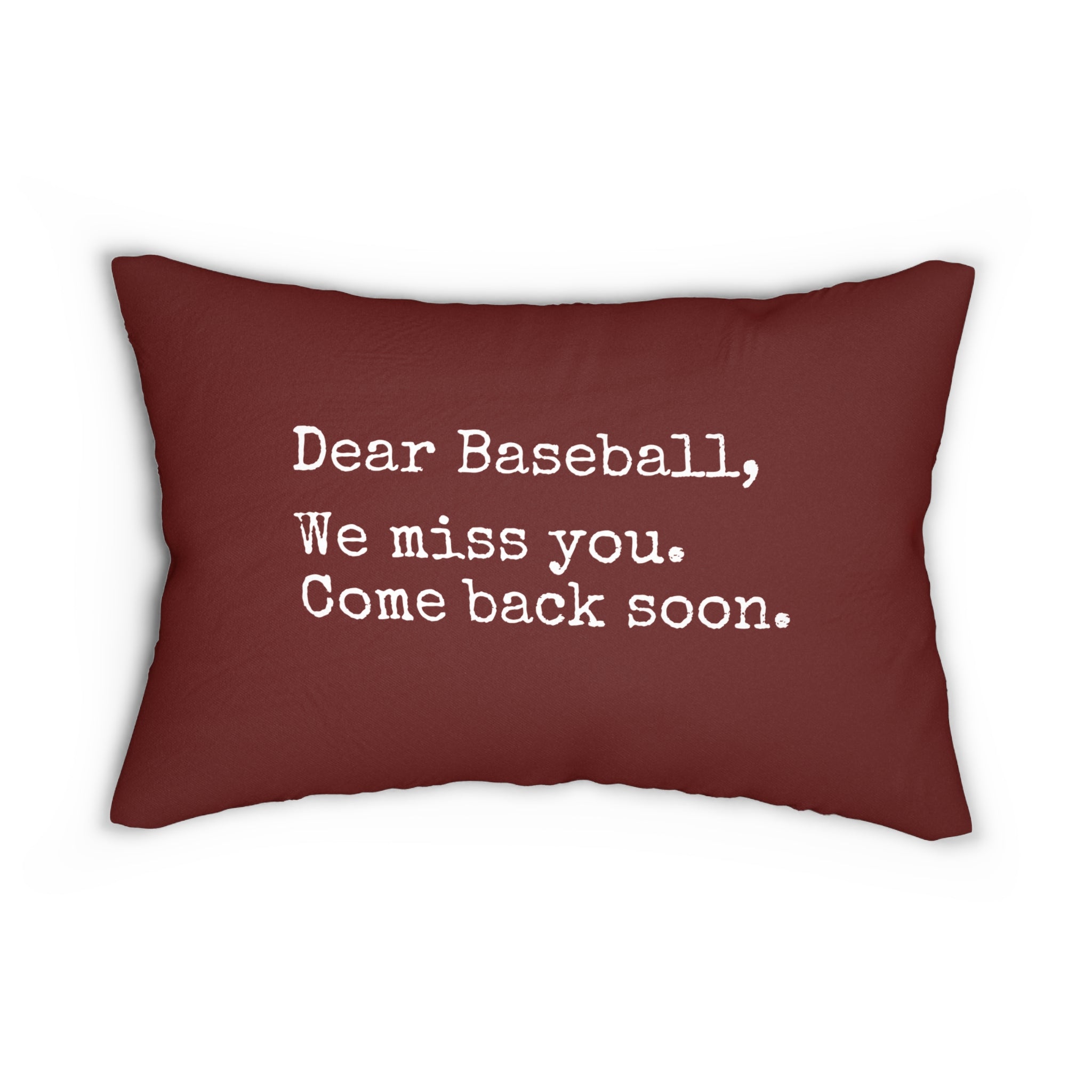Celebrate baseball in your home...no matter the season...with our 2 sided lumbar pillow. Our original Baseball Family® design features a different message on each side in intentionally distressed typewriter font. Measures 20" wide x 14" high and includes pillow insert with assembly instructions. Casing is made of a spun polyester fabric that is inherently mildew and water-resistant and includes a hidden zipper.