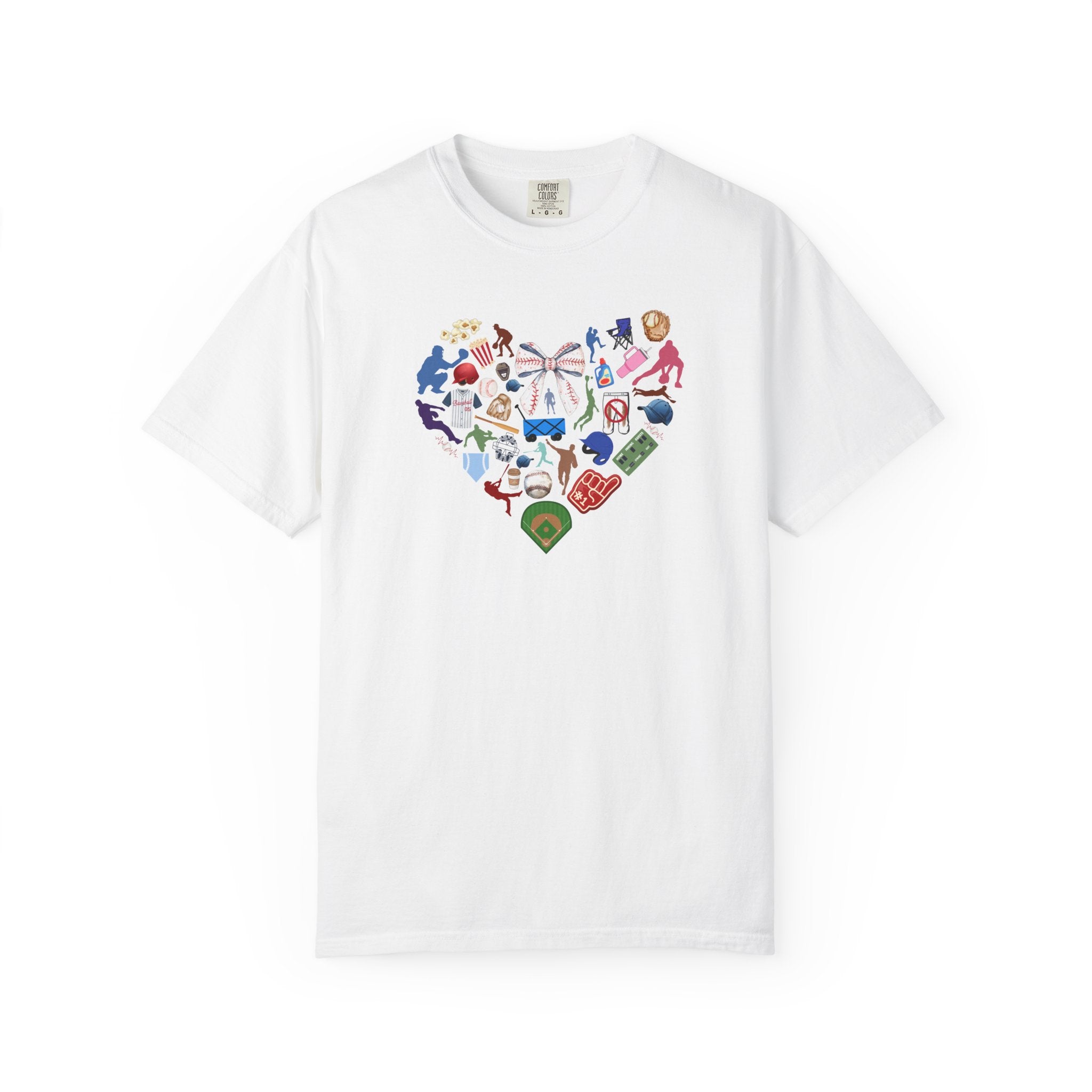 Our original Baseball Family® Baseball Heart Collage design is available on a Comfort Colors unisex short sleeve t-shirt made with 100% with ring-spun cotton. The garment-dyed fabric provides a vintage look, and is pre-shrunk for little to no shrinkage over time. Double needle stitching and lack of side-seams help the shirt retain its tubular shape. UNISEX SIZE: SIZE UP FOR A LOOSER FIT. Available in White, Island Reef, Sapphire and Crunchberry in sizes SM-2XL.