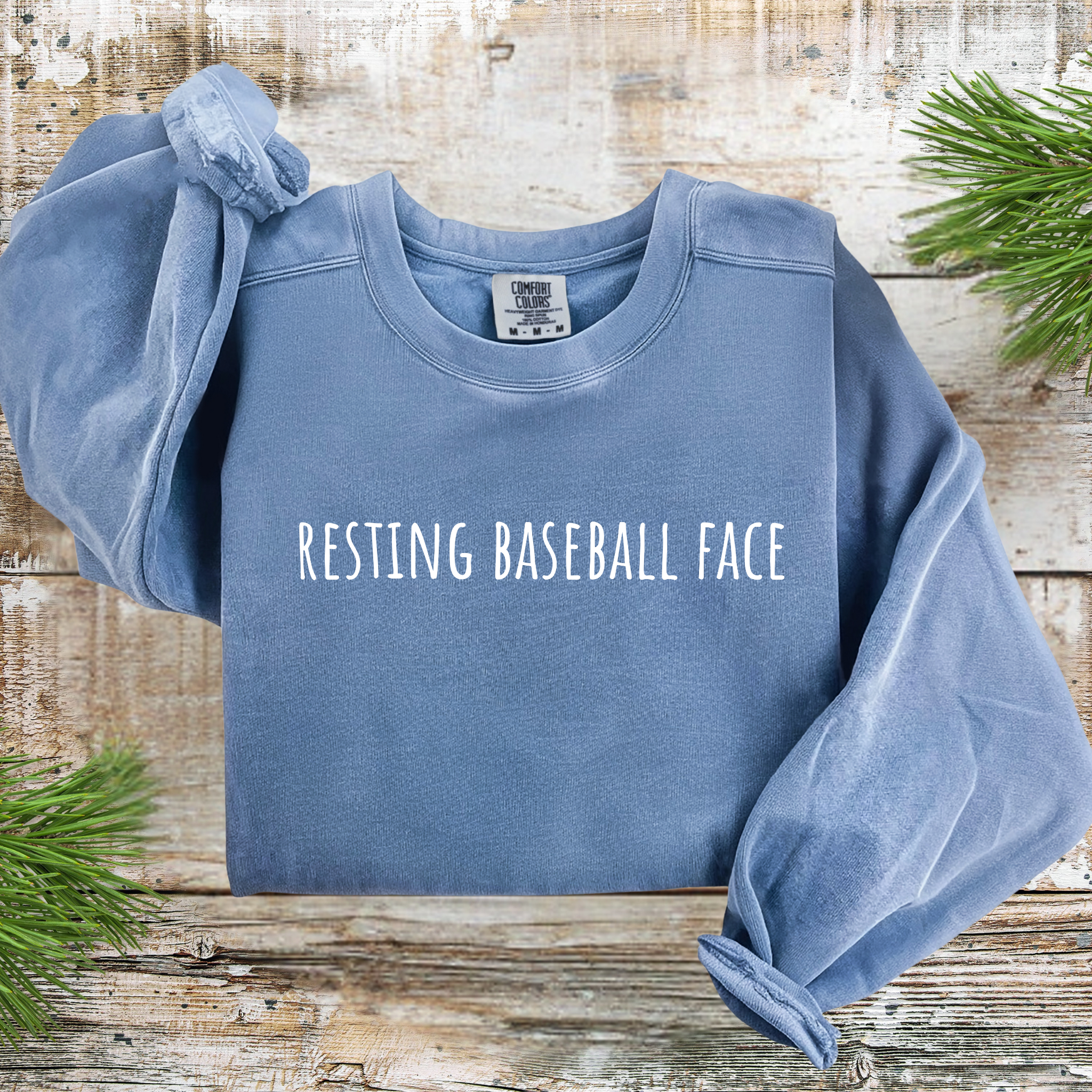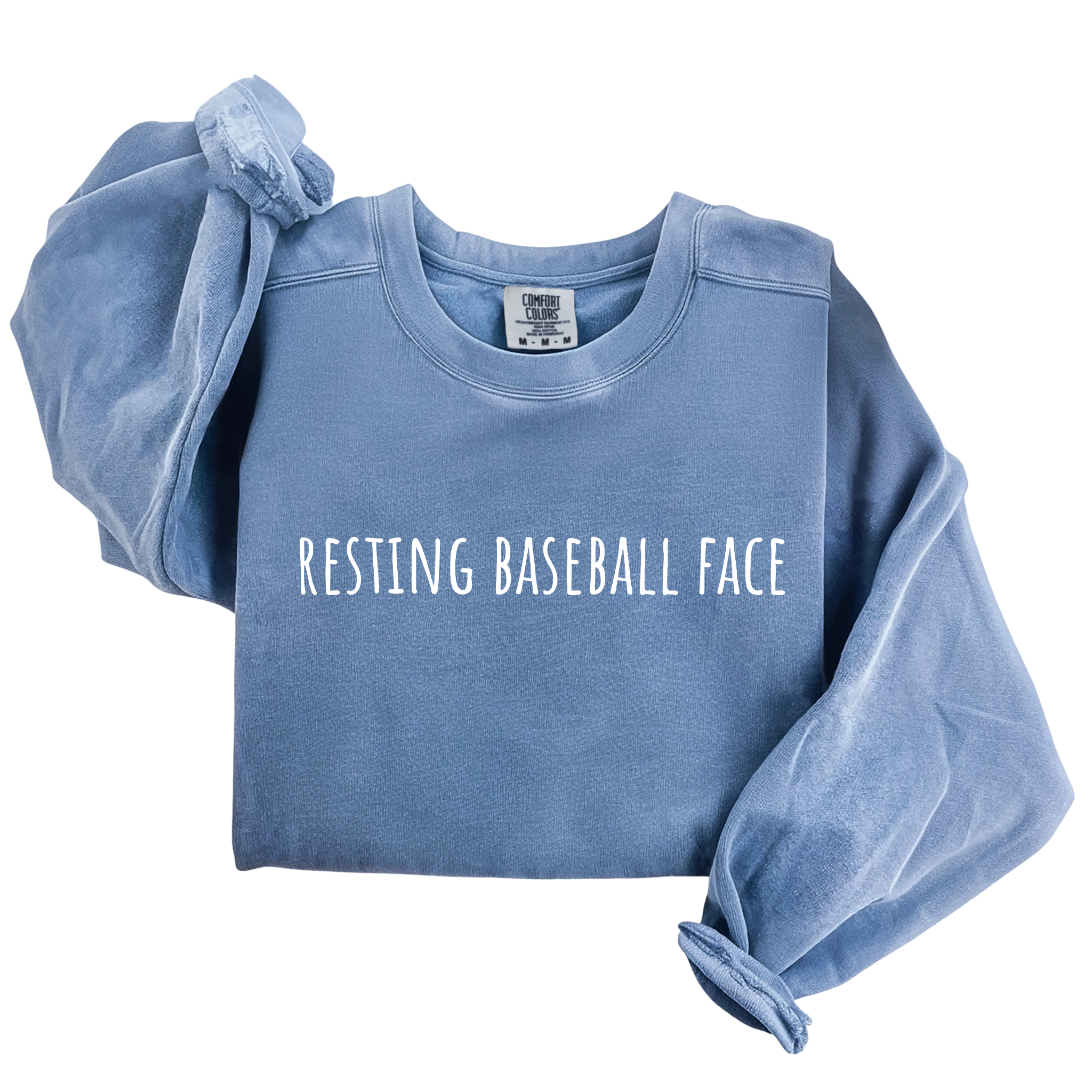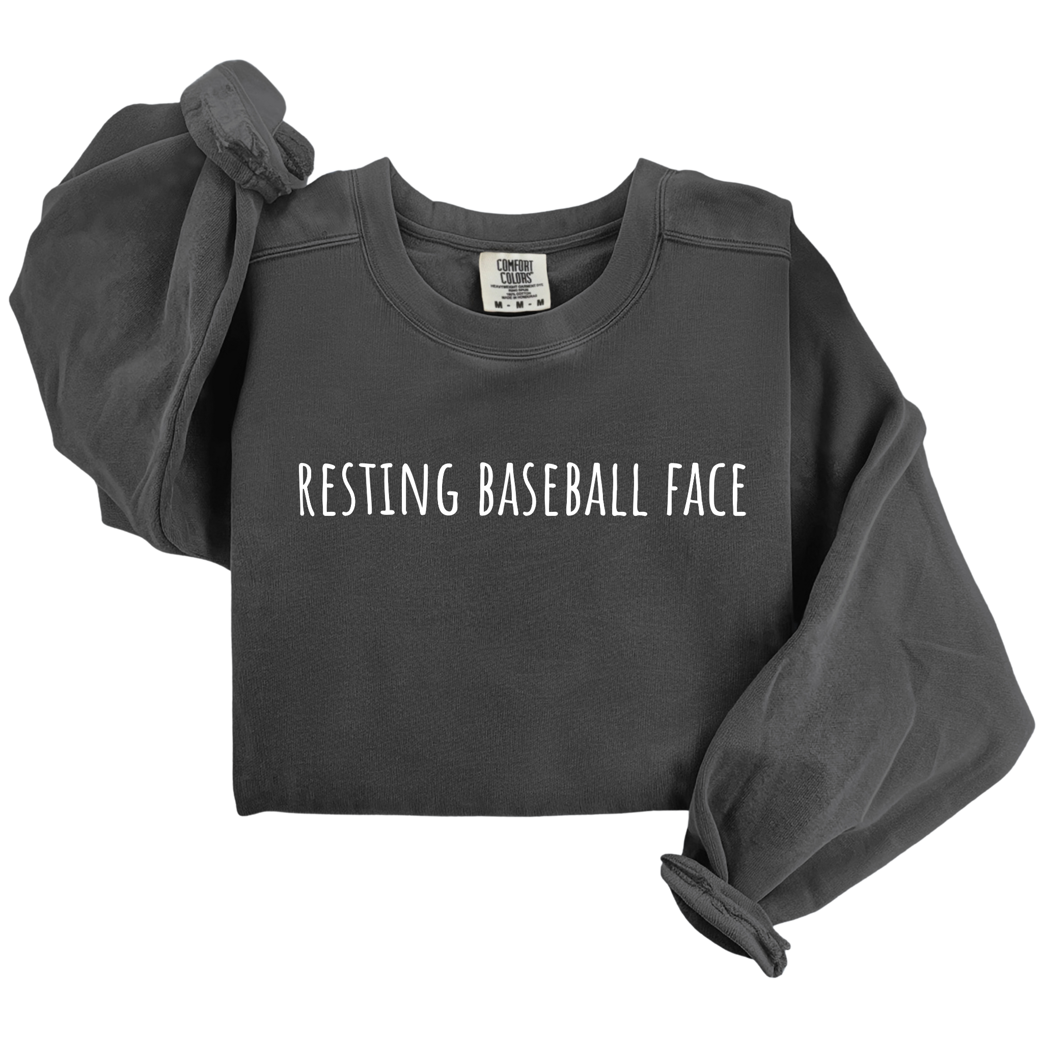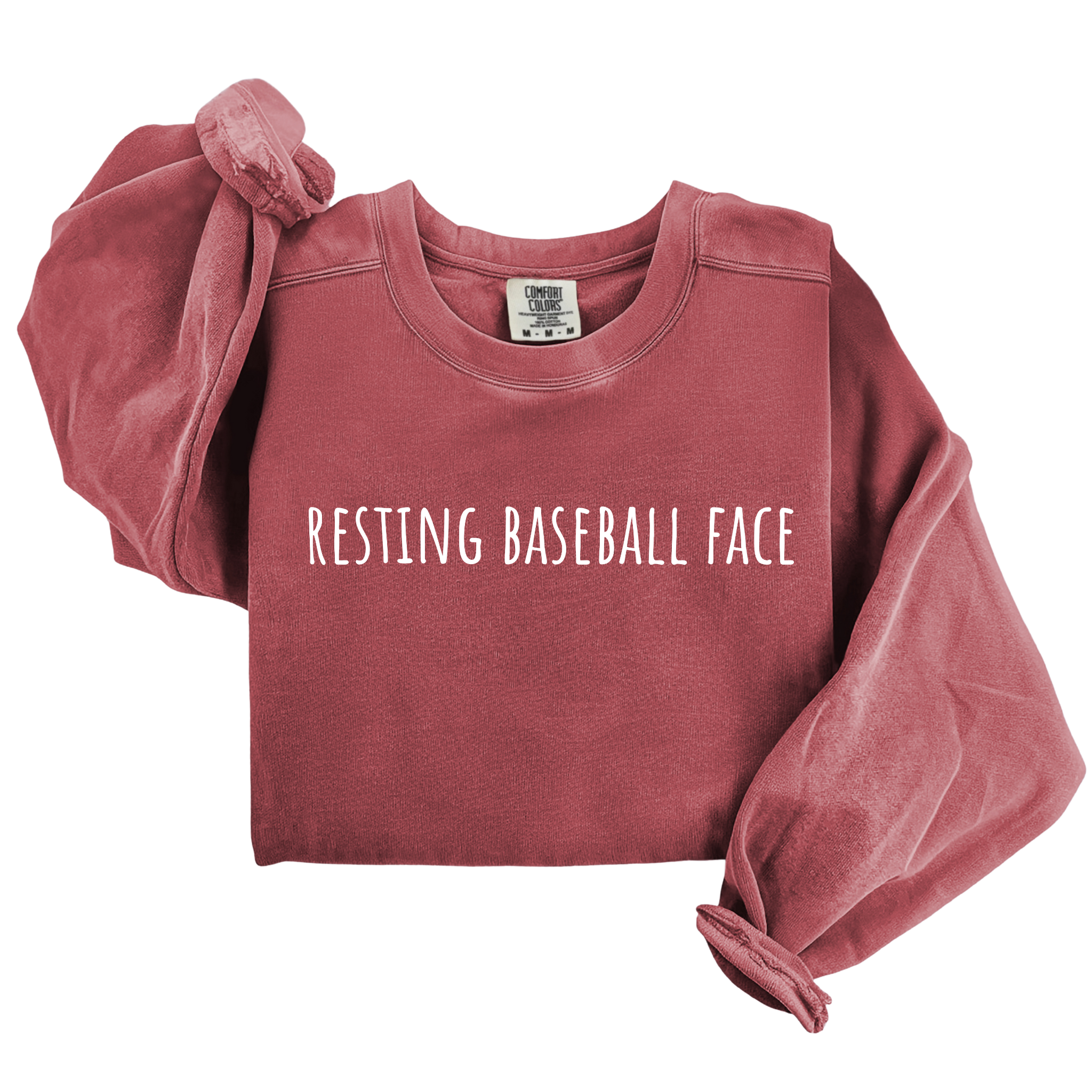 If offseason baseball has left you with Resting Baseball Face, why not show it off in our Comfort Colors Crewneck sweatshirt? Our original Baseball Family® design in trendy lettering is available in Pepper, Crimson, Blue Jean and Light Green on a unisex garment-dyed sweatshirt in sizes SM-2X.